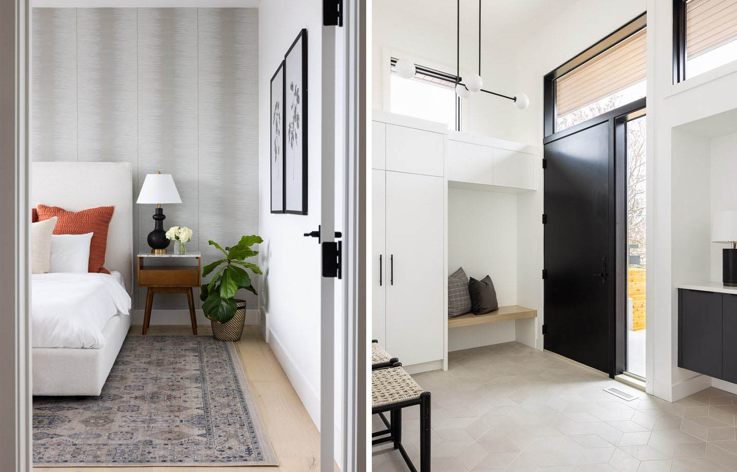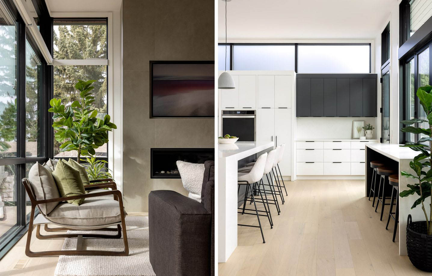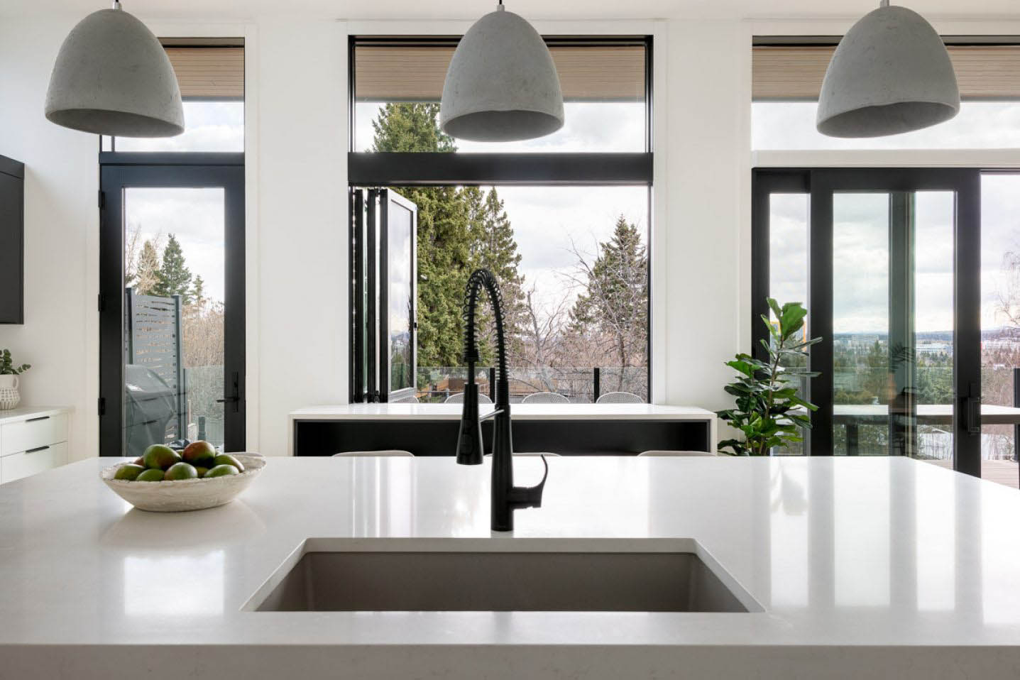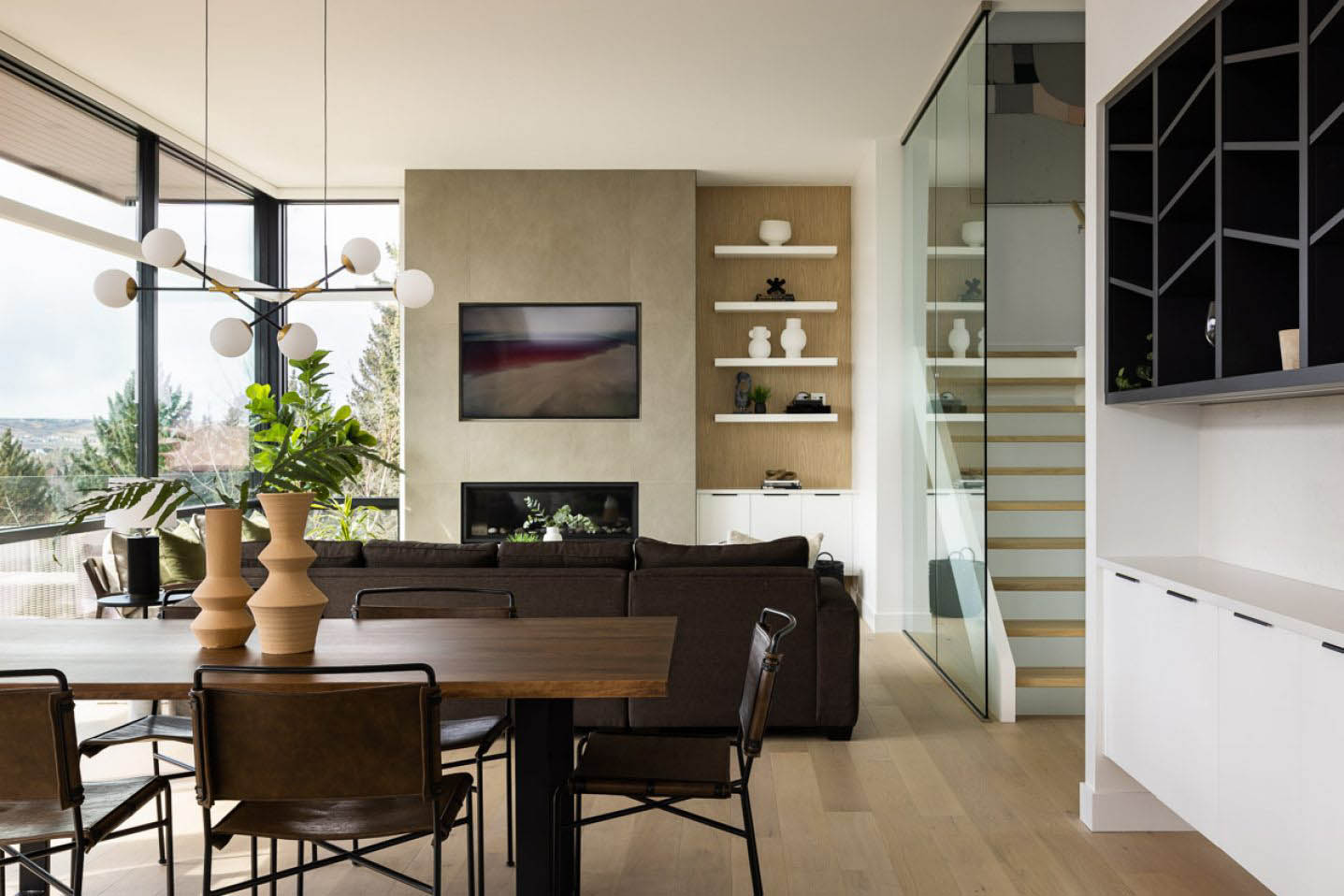 The primary living areas boast soaring 12-foot ceilings, anchored by an impressive 45-foot glass wall and a full-width rear deck. Panoramic views of the Bow River Valley, the University, and the distant mountains unfold from every room. A custom NanaWall door effortlessly folds open, creating a wide, unobstructed connection between the kitchen and deck for truly seamless indoor/outdoor entertaining.
