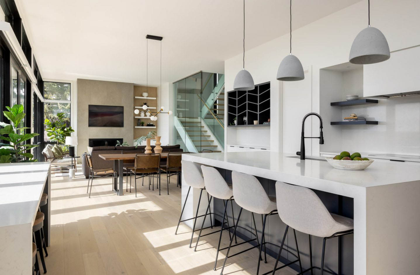 This modern family home is thoughtfully designed to maximize sweeping city and mountain views from its elevated site. Honouring the mid-century architecture of the neighbourhood, the home features clean lines, bright open spaces, and seamless indoor/outdoor living, perfect for entertaining.