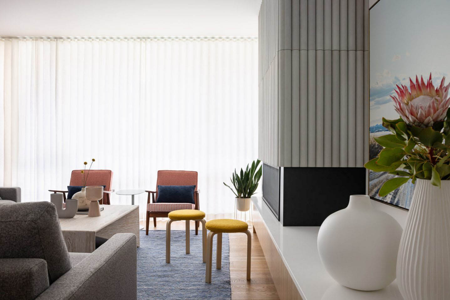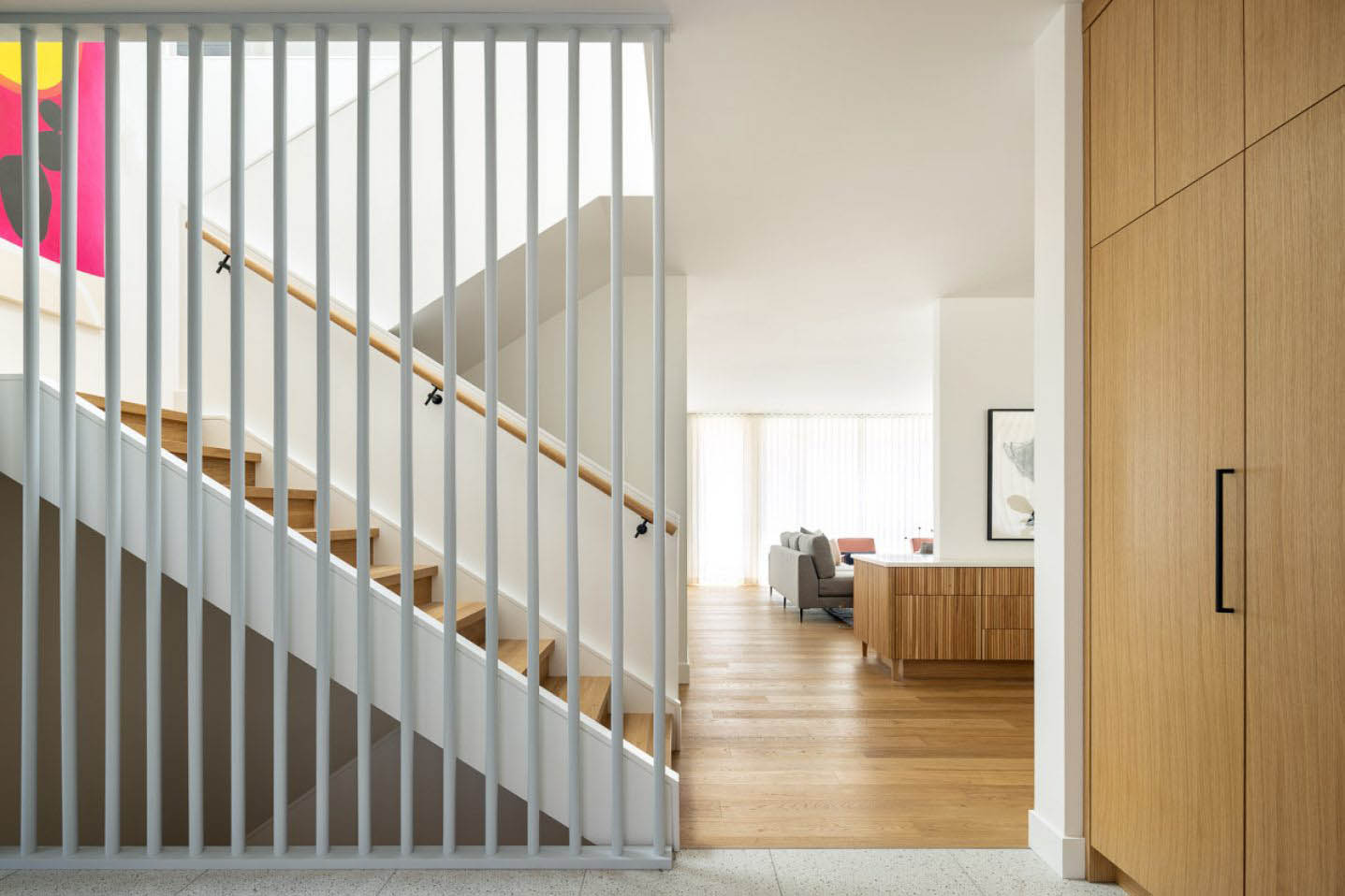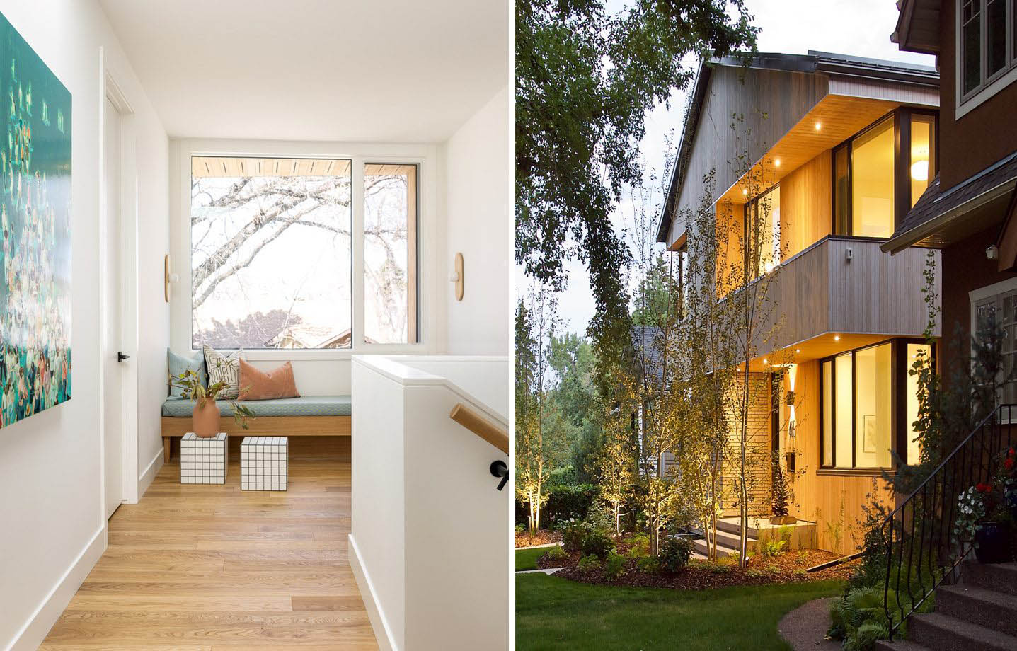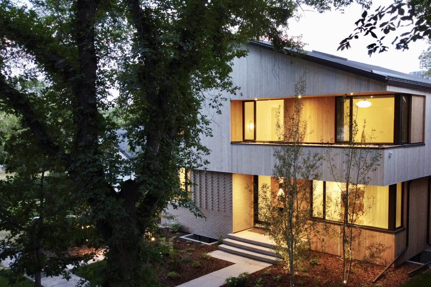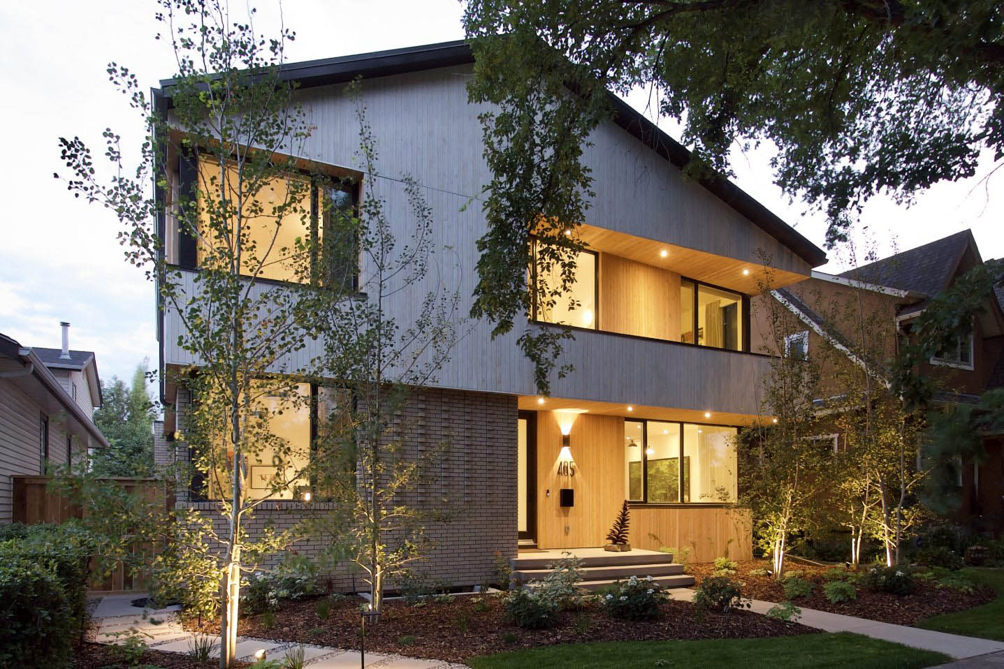 This Scandinavian-inspired family home is wrapped in warm, organic materials and features large, high-performance windows that frame the tree-lined streetscape and private backyard. The home’s form is artfully articulated through striking cut-outs and deep shadow lines, thoughtfully designed to echo the architectural rhythms of the neighbouring heritage houses.