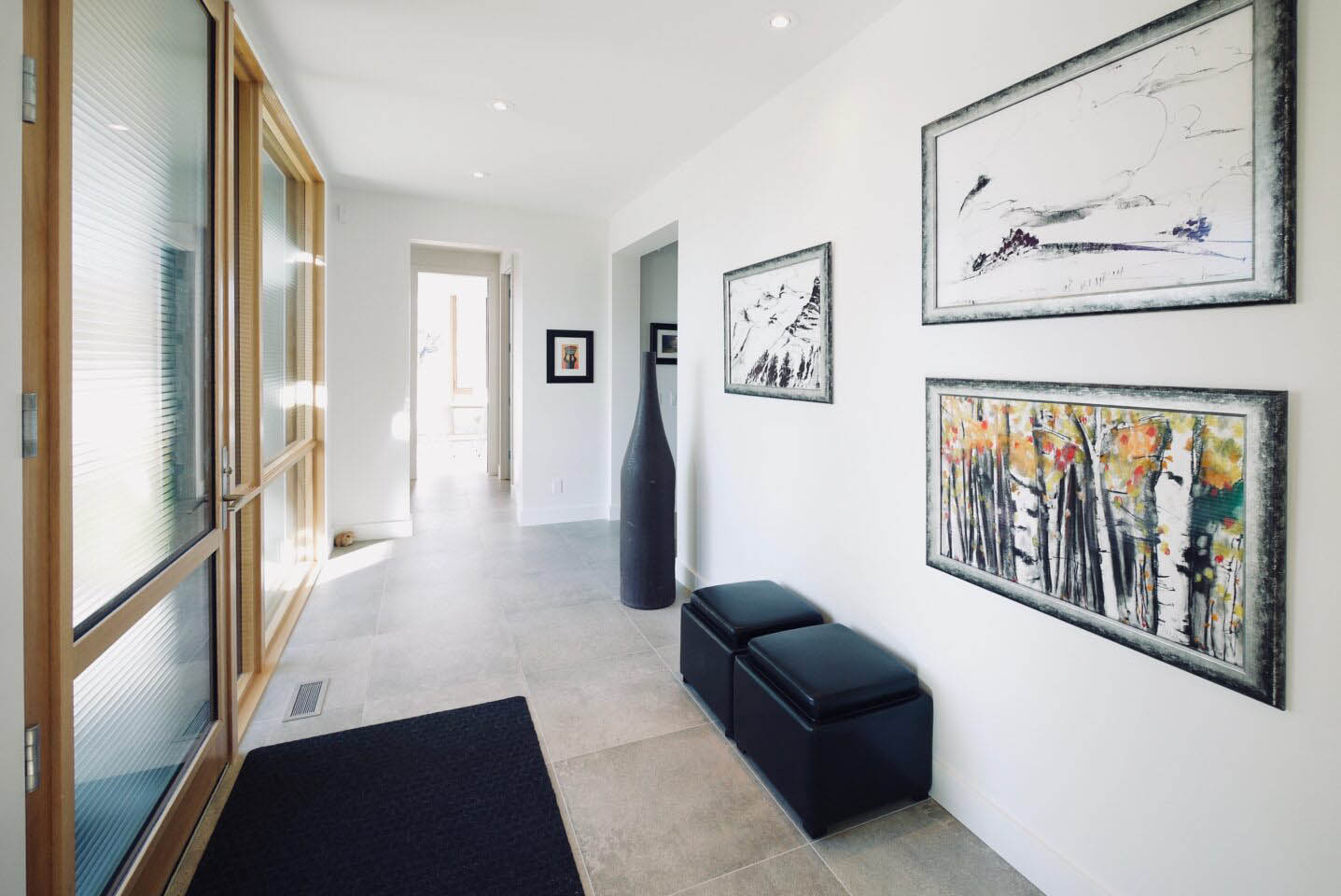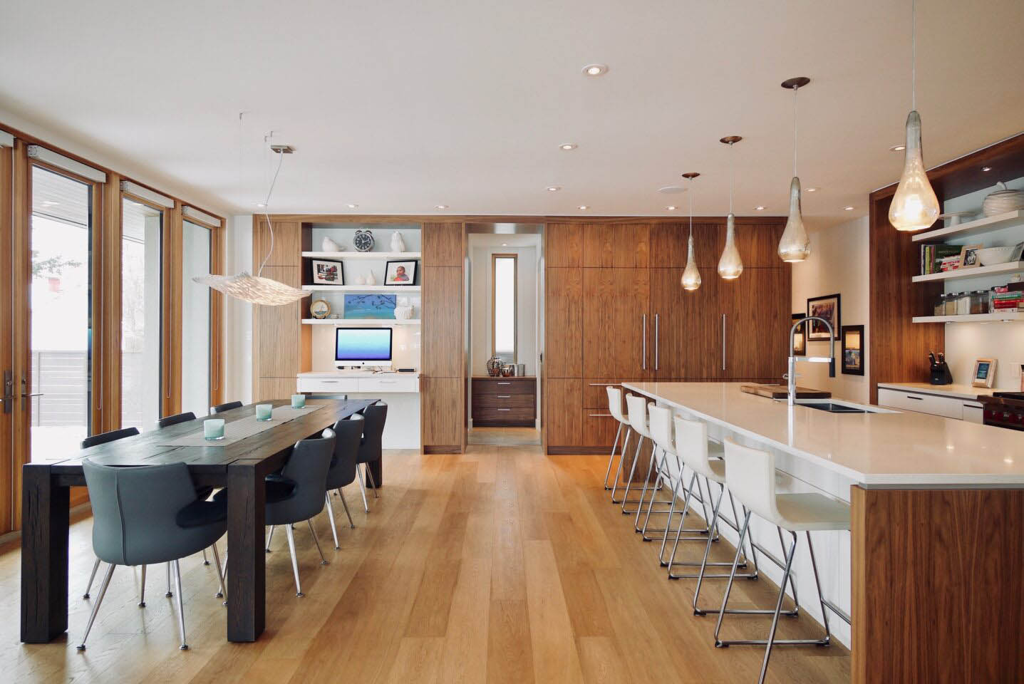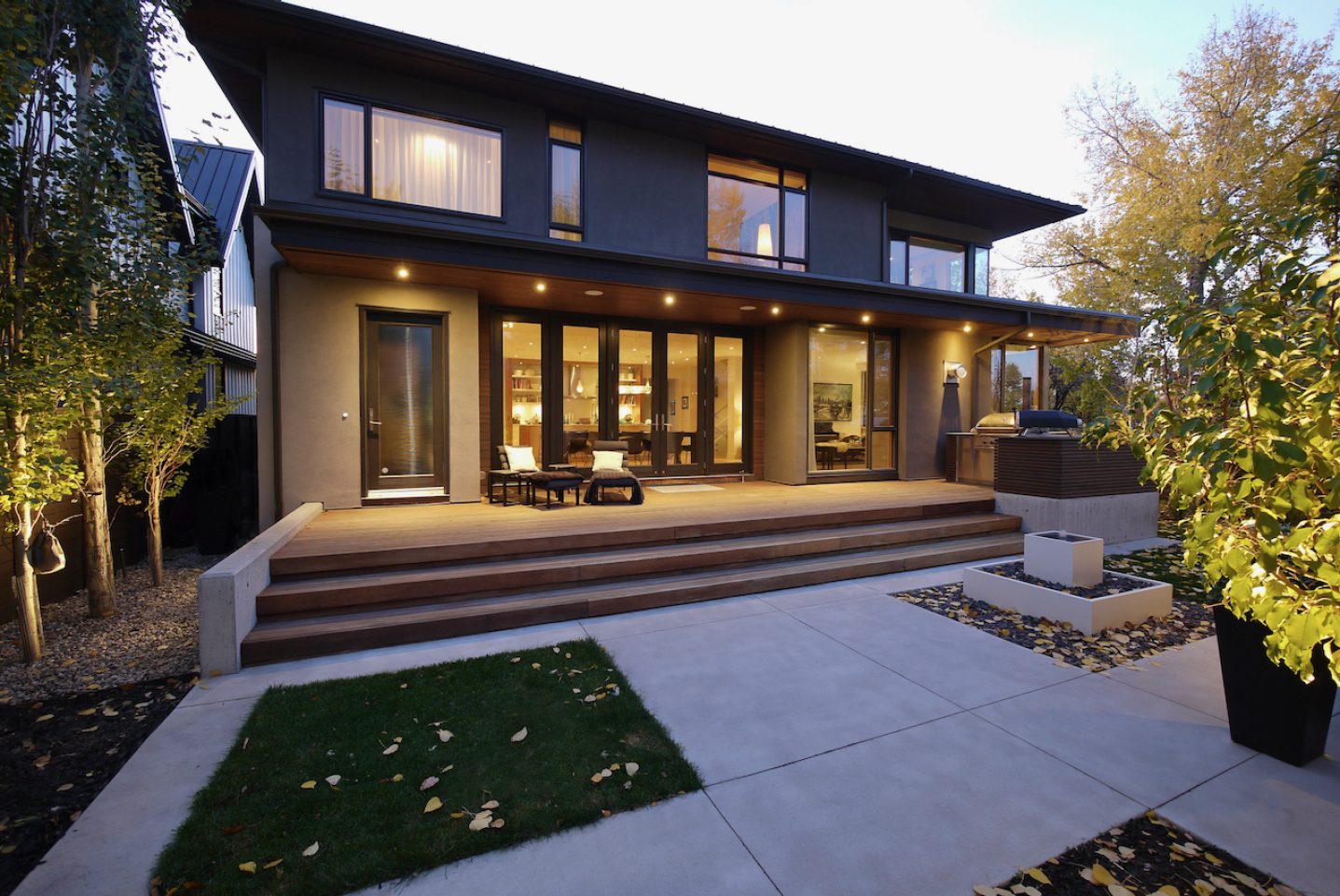 The extensive use of natural materials and a warm earth-tone exterior palette soften the home’s modern lines, allowing it to harmonize beautifully with the established community. Large triple-glazed windows and doors flood the interiors with natural light throughout the year. A rooftop patio at the front offers sweeping views of the cityscape and the distant mountains beyond.