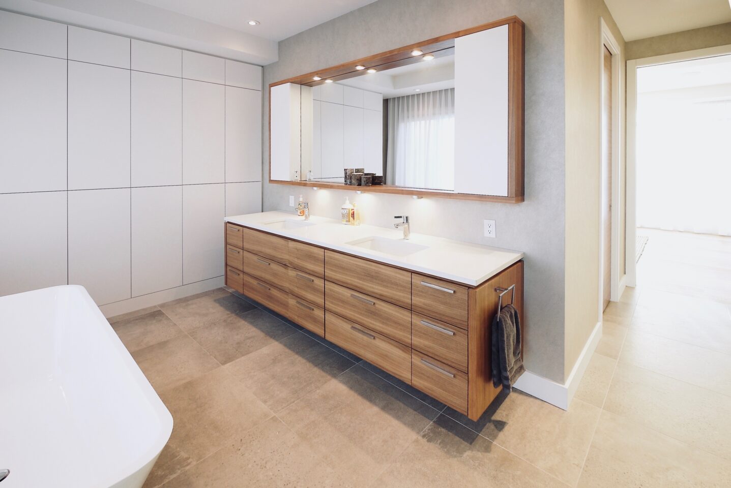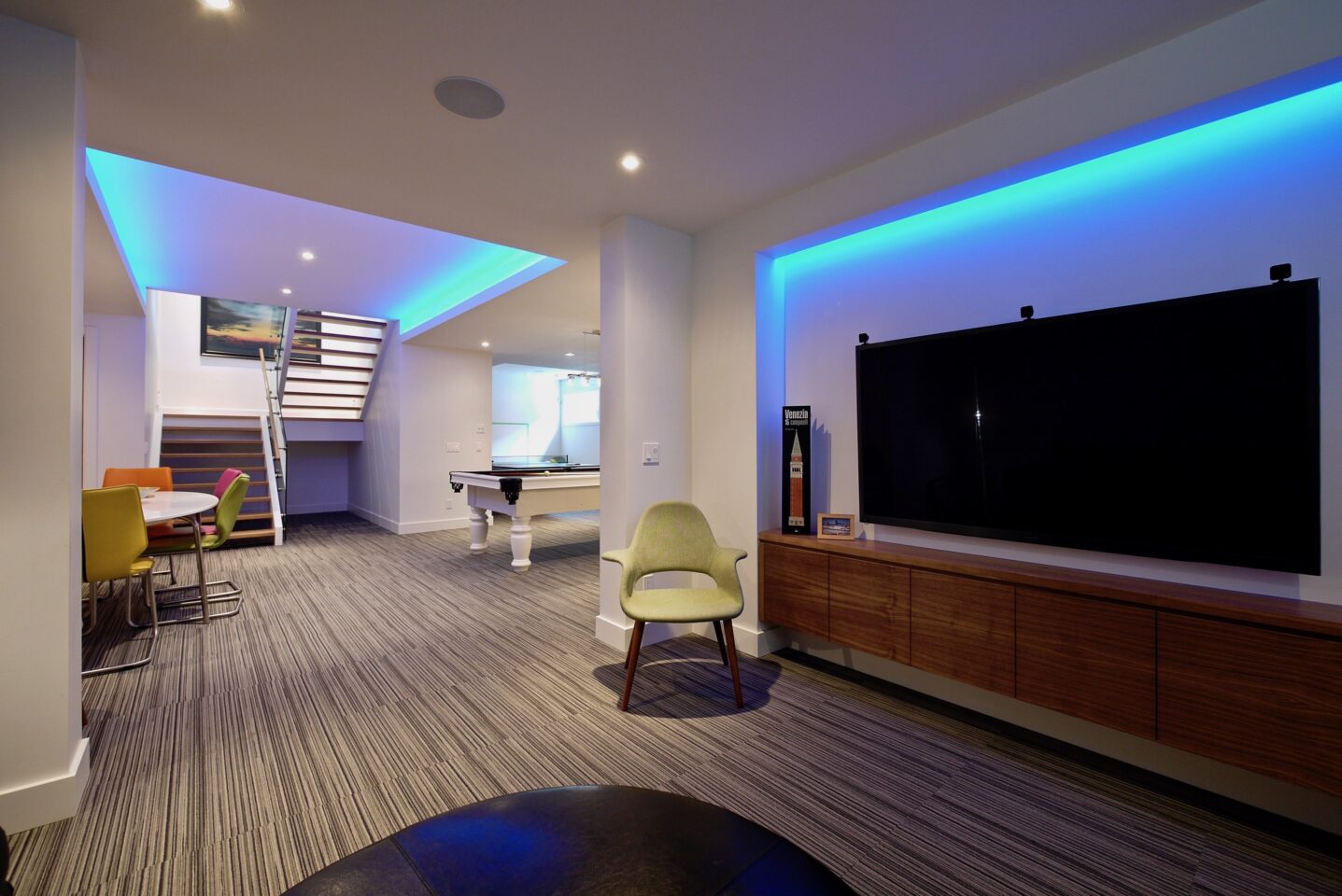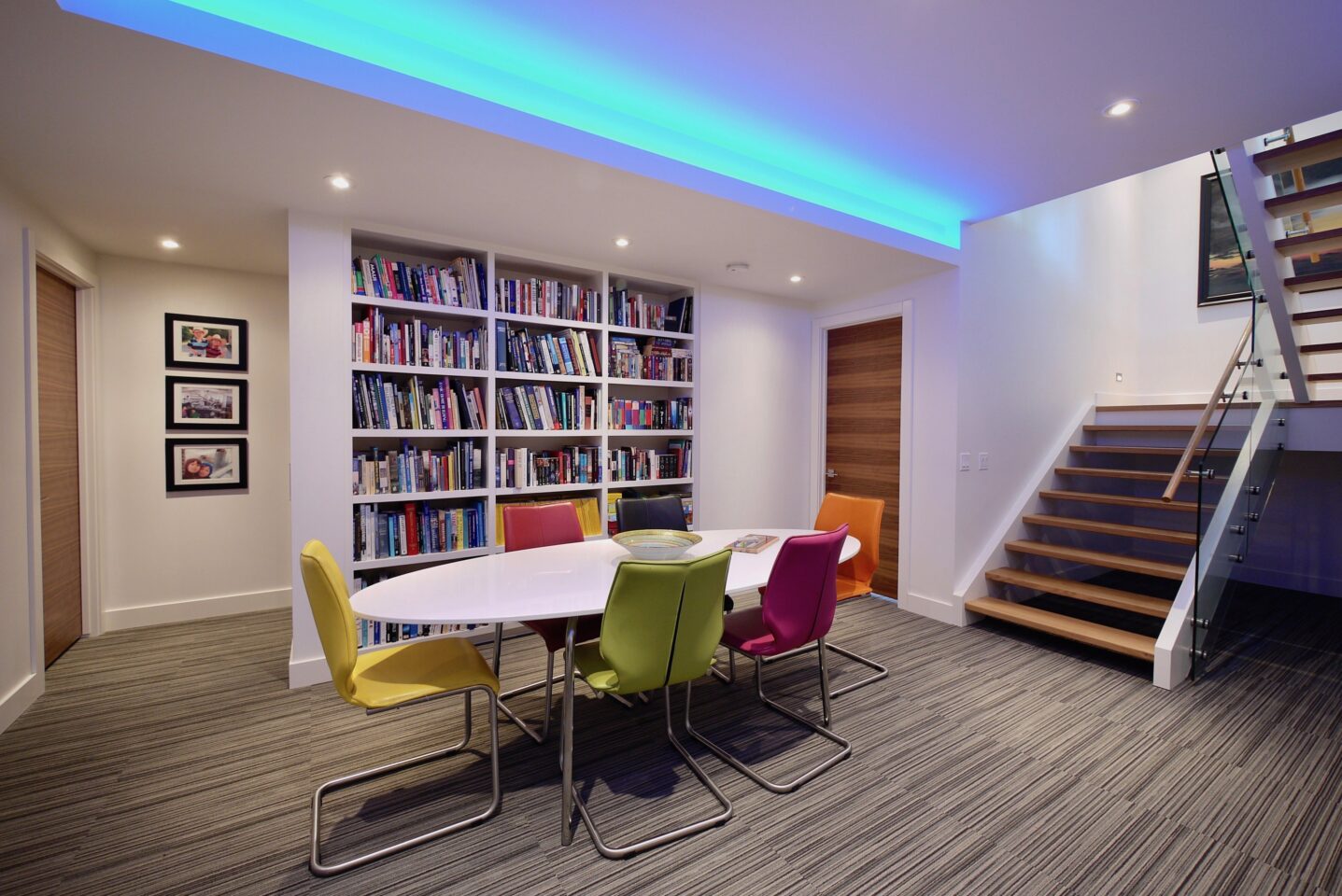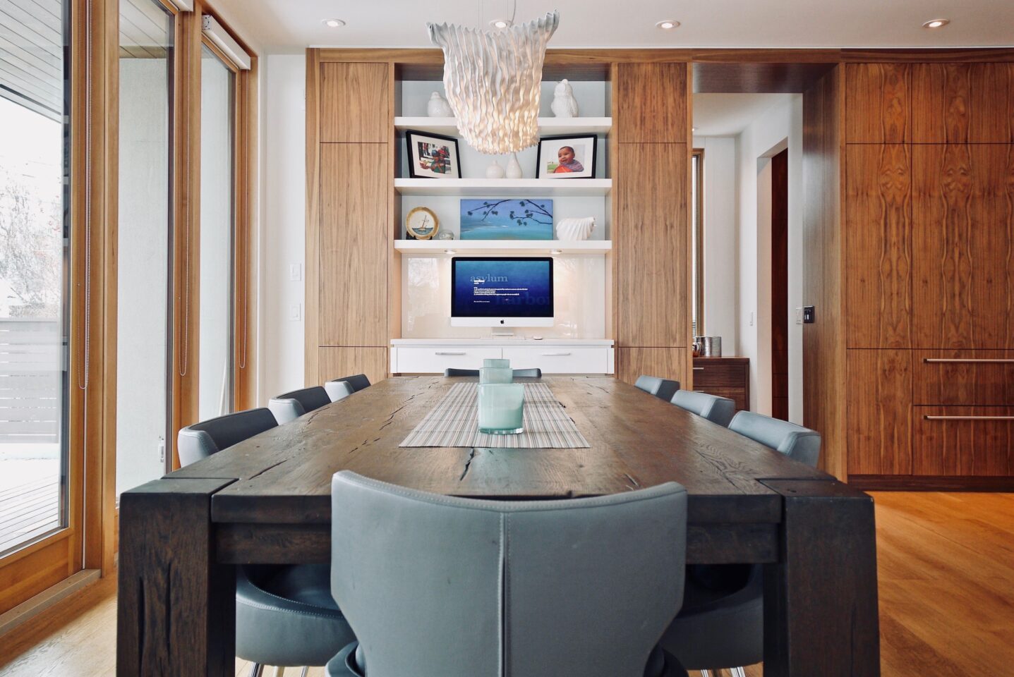 The extensive use of natural materials and a warm earth-tone exterior palette soften the home’s modern lines, allowing it to harmonize beautifully with the established community. Large triple-glazed windows and doors flood the interiors with natural light throughout the year. A rooftop patio at the front offers sweeping views of the cityscape and the distant mountains beyond.