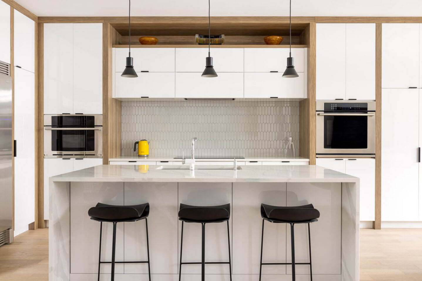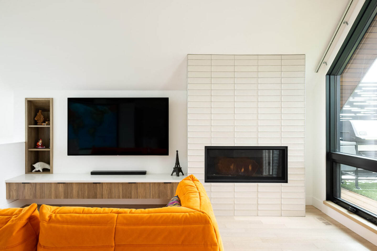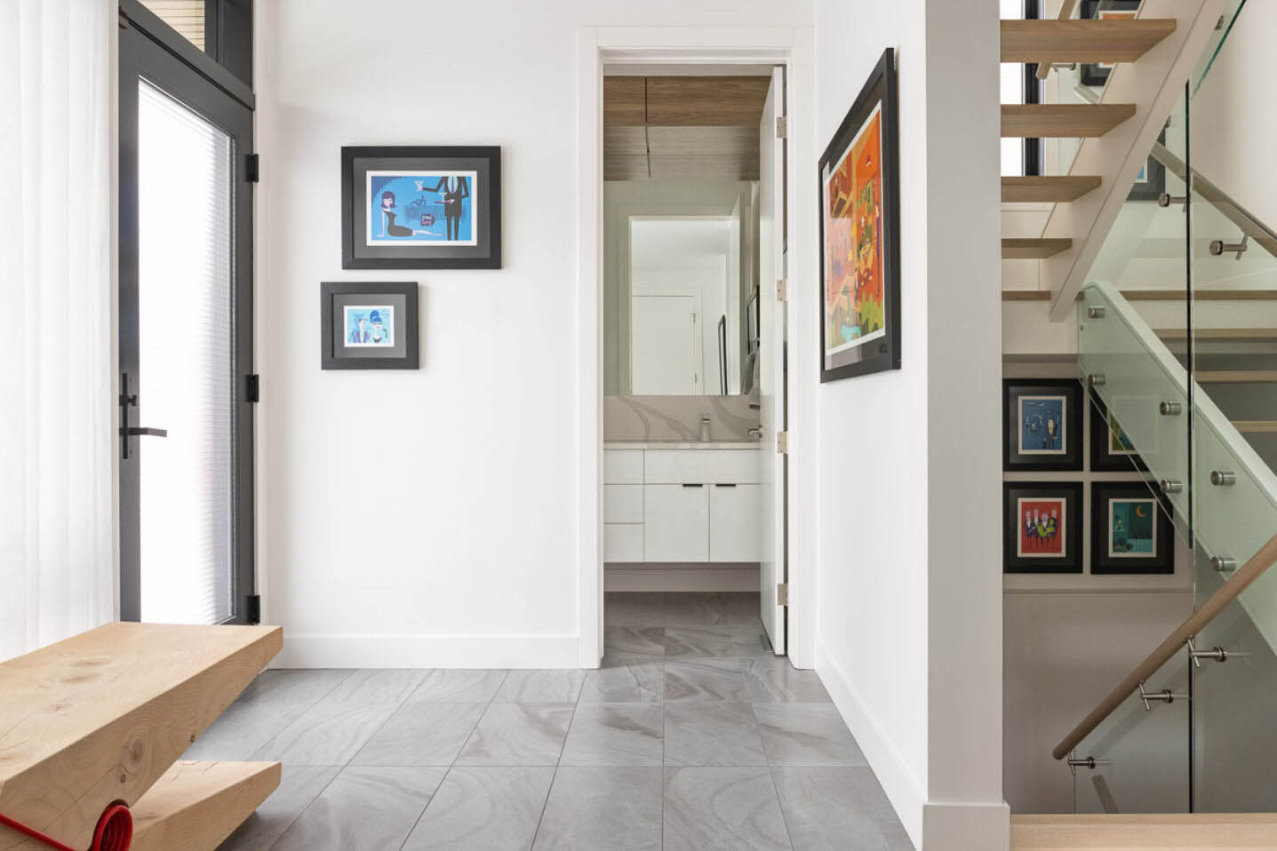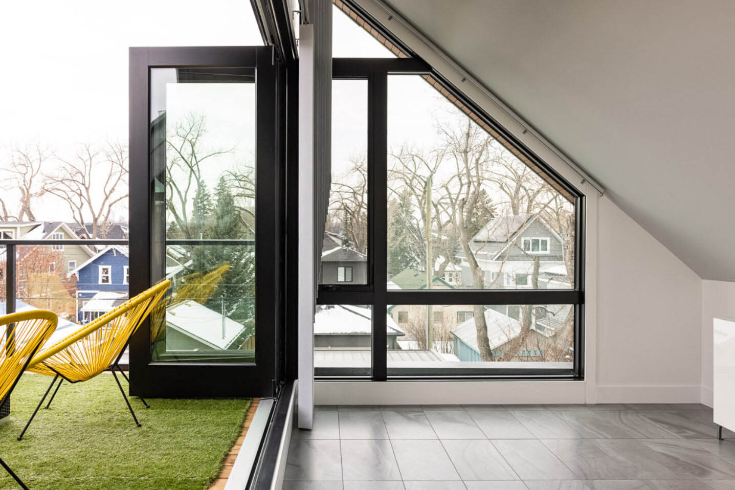 This vertically oriented home expertly maximizes a compact urban site. Its north wall folds over the structure, creating a protective wrap around a secluded south-facing rooftop terrace. Half of the terrace is enclosed by a folding glass wall, transforming it into a versatile indoor/outdoor retreat that remains comfortable well into the shoulder seasons. Designed with energy efficiency in mind, the home features high-performance triple-glazed windows and integrated solar power generation.